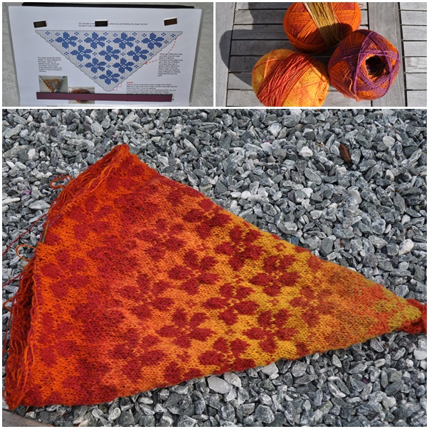 Il avance doucement mon châle, au rythme de mes interrogations multiples et variées! Dois-je faire suivre les fils, les tisser, embrouiller mes laines, les entortiller?????? Malgré tout, il pousse gentiment comme pour me dire: « ne t’inquiète pas…au blocage », enfin vous connaissez la chanson!
